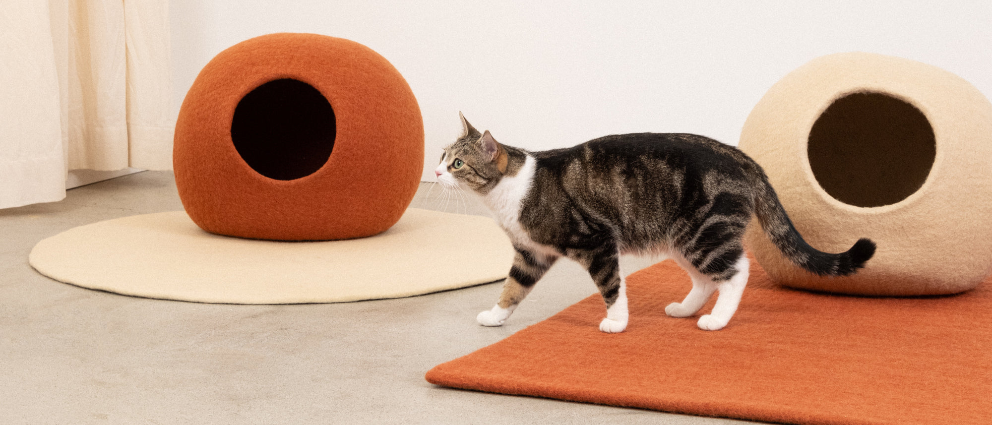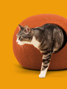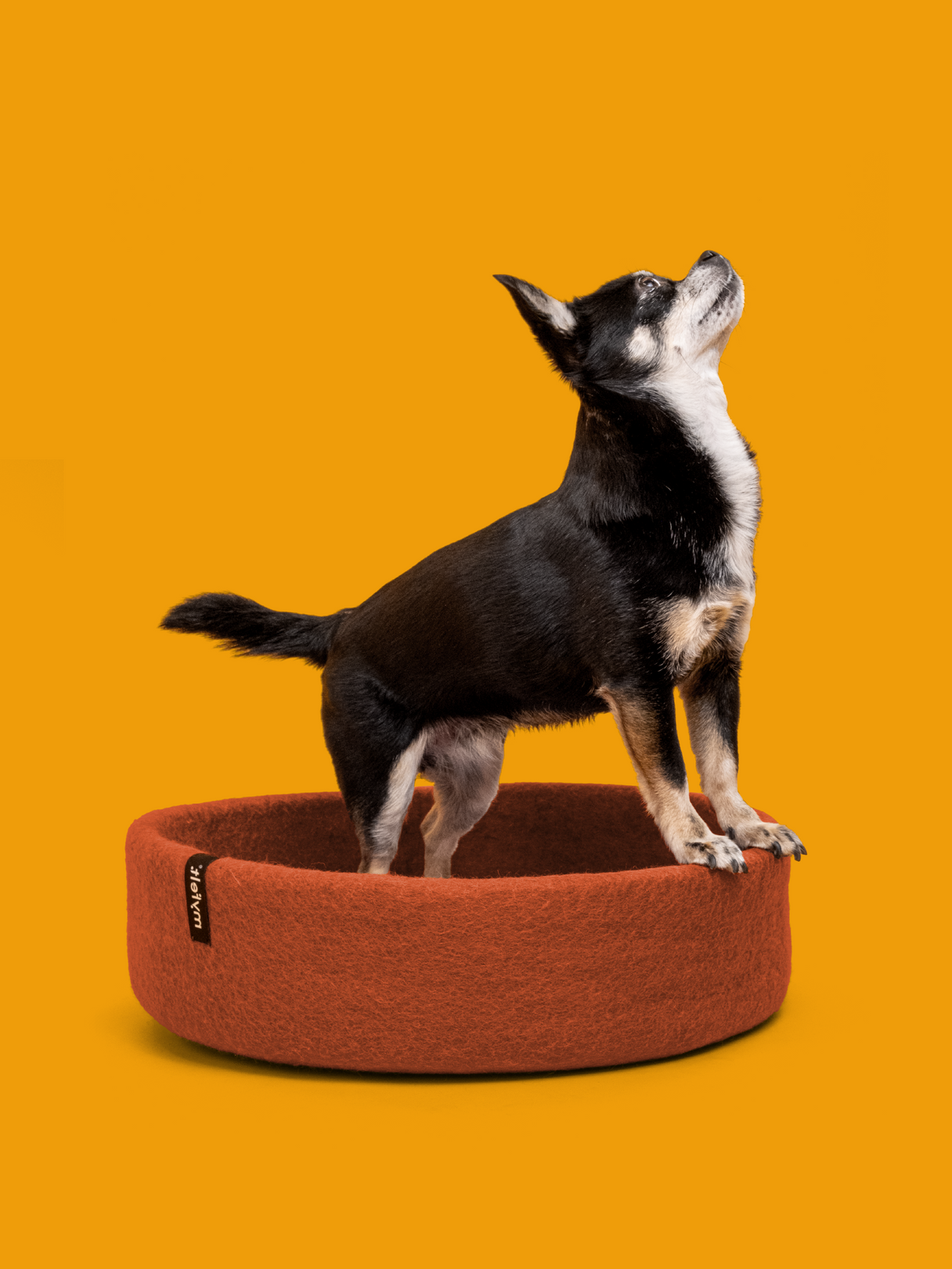 Both cats and dogs feel comfortable and safe in the caves and baskets hand-made from pure new wool. The sustainable material is easy to care for, hygienic and antibacterial thanks to the natural wool fat. Wool felt has antistatic properties and regulates temperature. The felt caves for cats and baskets for dogs are warm and comfortable in winter and pleasantly cool in summer.