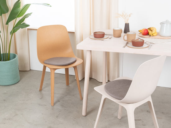 The gray, flat seat pad Kian brings warmth and softness to your favorite chair. Made from pure new wool, handcrafted in Nepal and produced under fair conditions. myfelt seat pads are water- and dirt-repellent and can be used on both sides.
