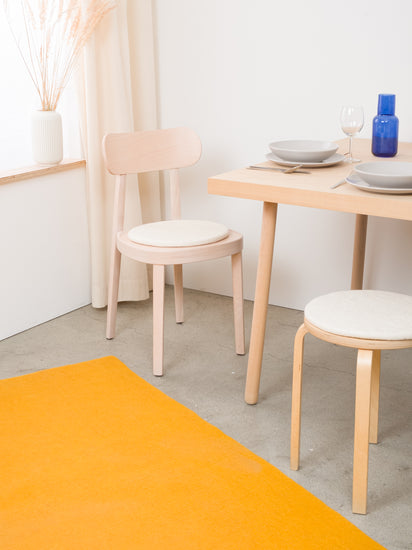 For the handmade, white seat pad Linéa (36 cm, round) pure virgin wool is felted to a flat cushion. The pad not only creates a pleasant and comfortable sitting feeling, but also creates a sophisticated and luxurious charm with its pure and honest design. myfelt seat pads are water and dirt repellent and can be used on both sides.