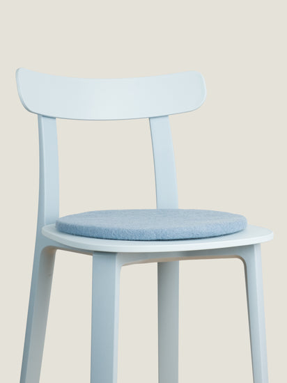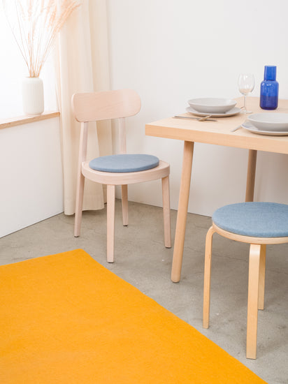For the handmade, light blue seat cover Mia (36 cm, round) pure virgin wool is felted to a flat cushion. The pad is not only pleasant and comfortable to sit on, but its classic design in discreet blue also creates an inviting look for your favourite chair. myfelt seat pads are water- and dirt-repellent and can be used on both sides.