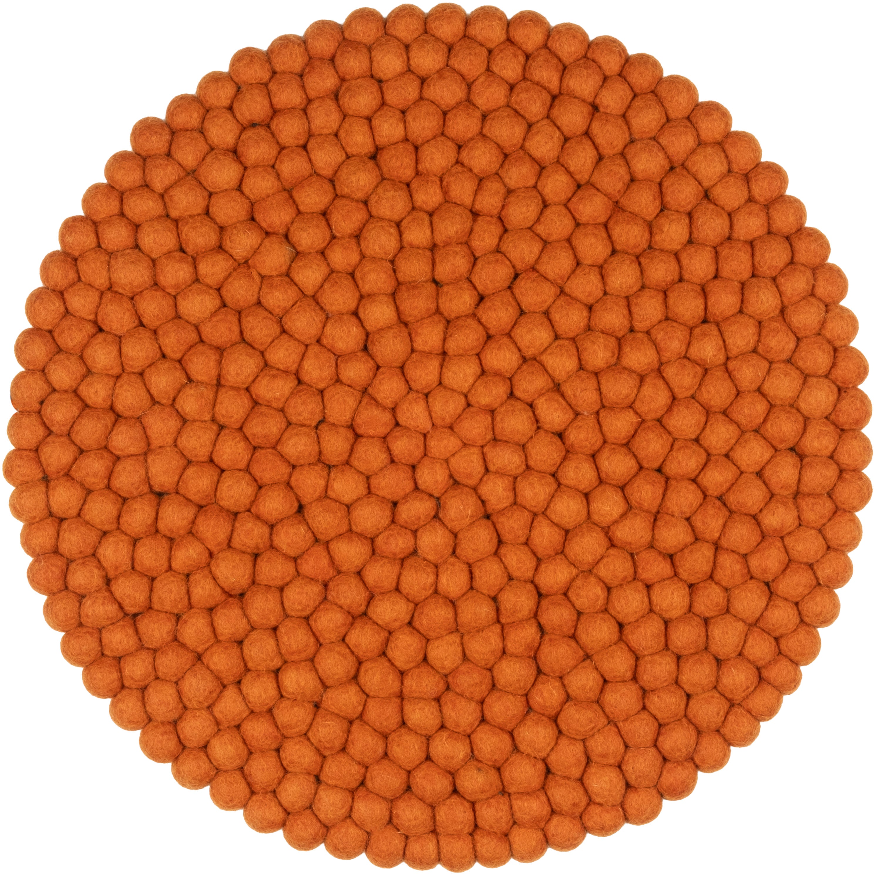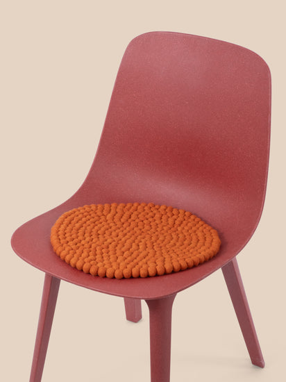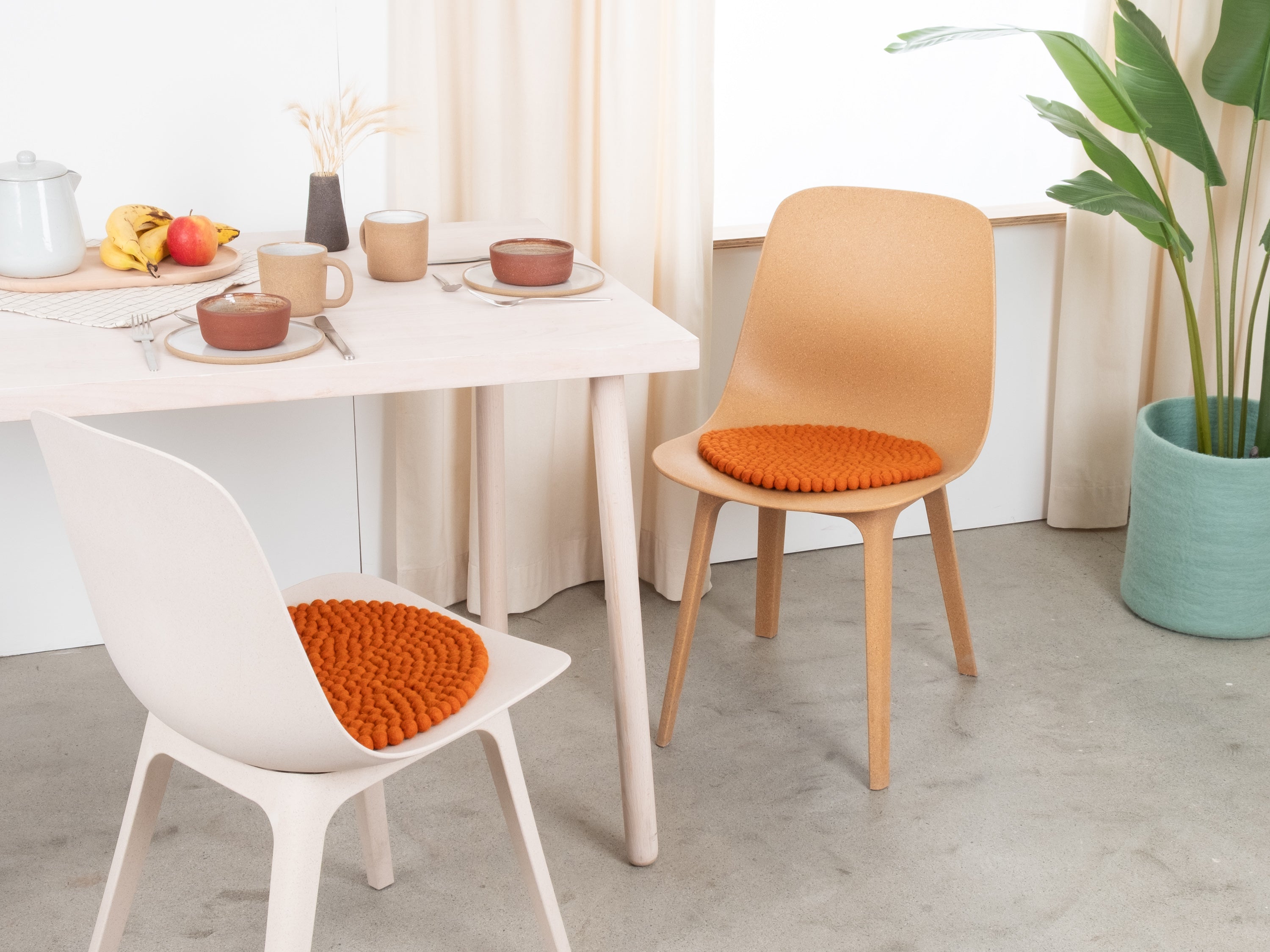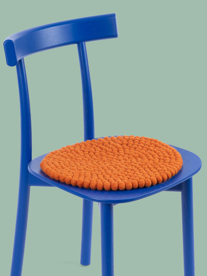 The orange-colored seat pad Afra brings warmth and softness to your favorite chair. Made from pure new wool, handcrafted in Nepal and produced under fair conditions. myfelt seat pads are water- and dirt-repellent and can be used on both sides.