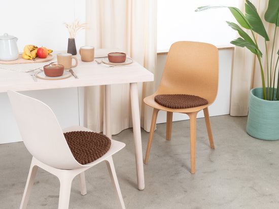 The brown seat pad Egon brings warmth and softness to your favorite chair. Made from pure new wool, handcrafted in Nepal and produced under fair conditions. myfelt seat pads are water- and dirt-repellent and can be used on both sides.