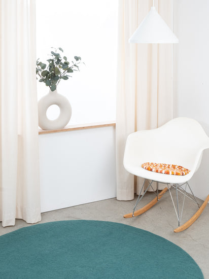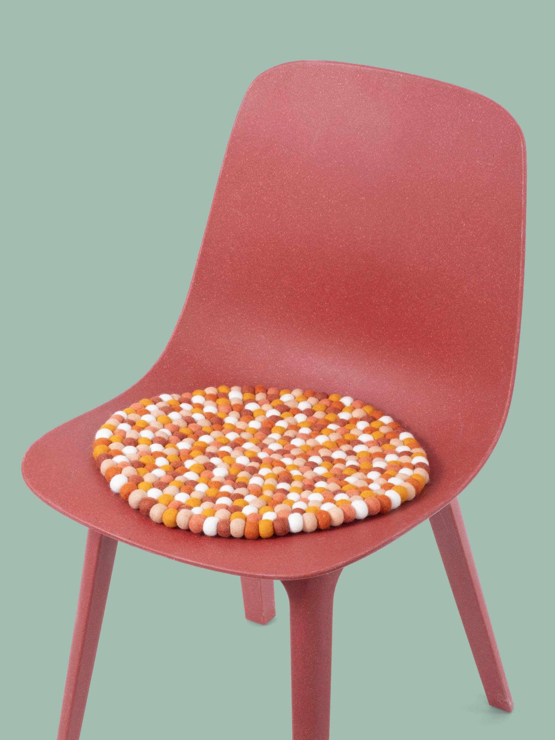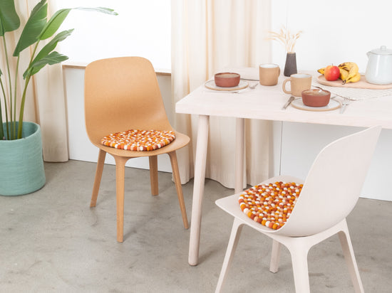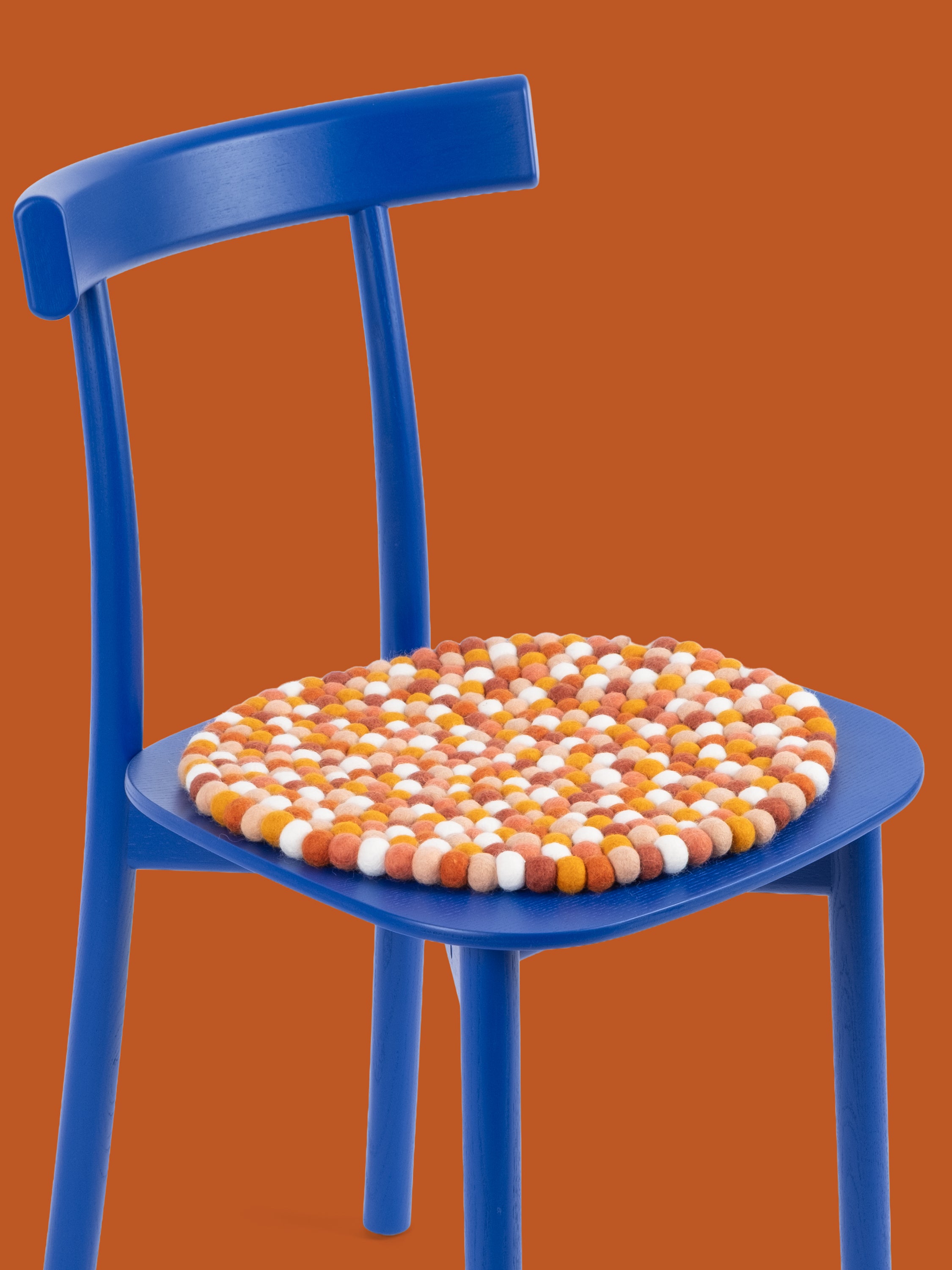 The multicolored seat pad Juna brings warmth and softness to your favorite chair. Made from pure new wool, handcrafted in Nepal and produced under fair conditions. myfelt seat pads are water- and dirt-repellent and can be used on both sides.