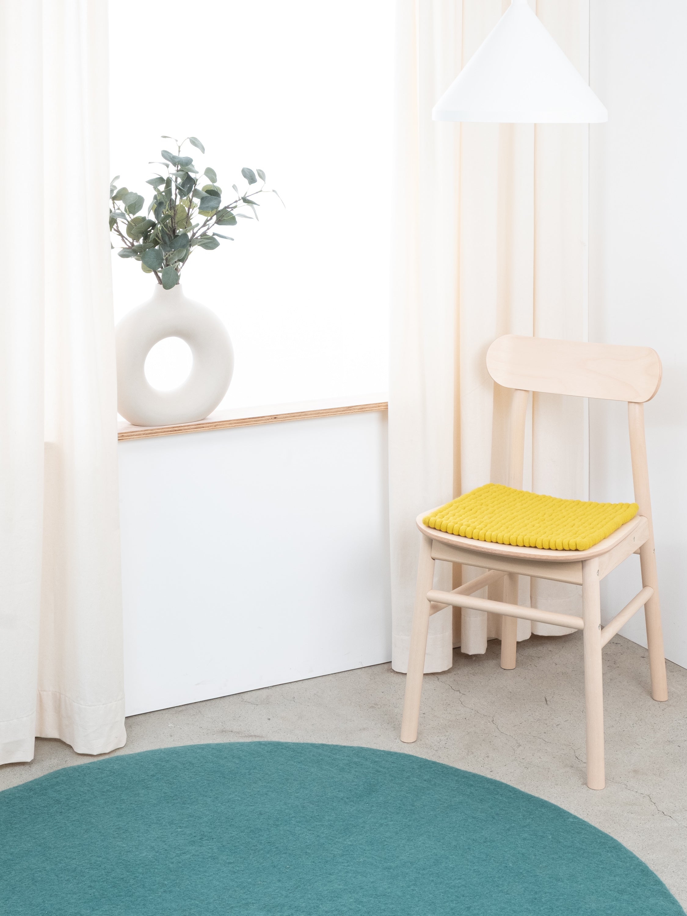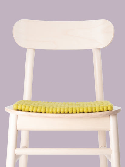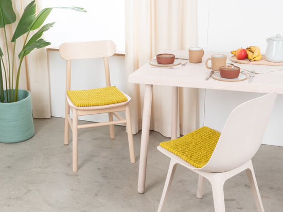 The green-yellow seat pad Kata brings warmth and softness to your favorite chair. Made from pure new wool, handcrafted in Nepal and produced under fair conditions. myfelt seat pads are water- and dirt-repellent and can be used on both sides.