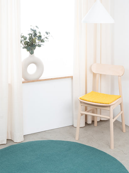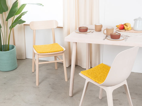 The yellow seat pad Kira brings warmth and softness to your favorite chair. Made from pure new wool, handcrafted in Nepal and produced under fair conditions. myfelt seat pads are water- and dirt-repellent and can be used on both sides.