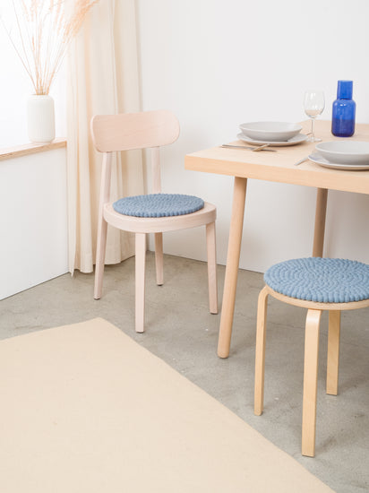 For the light blue Mia seat pad (36 cm, round), individual felt balls made of pure virgin wool are sewn together by hand. The pad is not only pleasant and comfortable to sit on, but its classic design in discreet blue also creates an inviting look for your favourite chair. myfelt seat pads are water- and dirt-repellent and can be used on both sides.