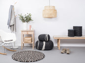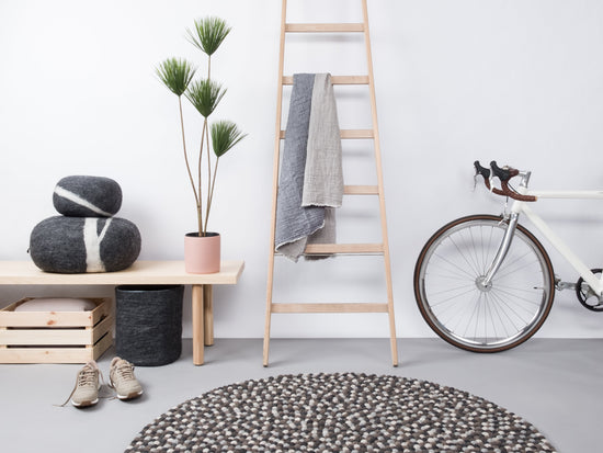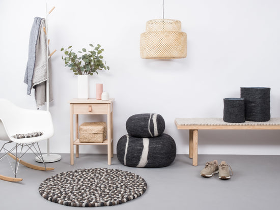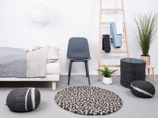 Not only does the undyed new wool give Néla the classic and timeless look, its combination of warm stone and earth colors creates a natural charm that creates exciting contrasts in your living room. The interplay of light and dark shades of grey with restrained shades of brown leads to a well-balanced curated color composition. Undoubtedly, Néla scores with her gentle and, at the same time, focused mind, which blends sublimely into the living space. Round and angular, Néla embodies a natural way of living and conveys the message: Life is beautiful.