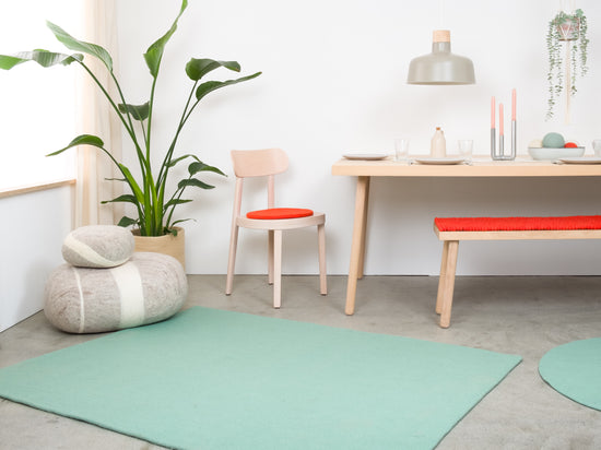 The square version of the Fine felt rug in turquoise fits seamlessly into any modern interior. The angular shape offers a pleasant change from traditional shapes and makes this carpet a real eye-catcher. Like our round version, Fine is made from sustainable materials and meets the highest social and ethical standards. The turquoise color radiates both calm and creativity and turns every room into a place of well-being.