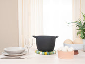 The trivet Finn in the colour multicolour combines functionality with charming design. Robust, heat-resistant, water- and dirt-repellent, and reversible. Made from pure new wool, handcrafted in Nepal under fair conditions.