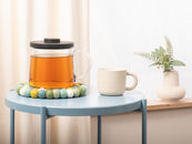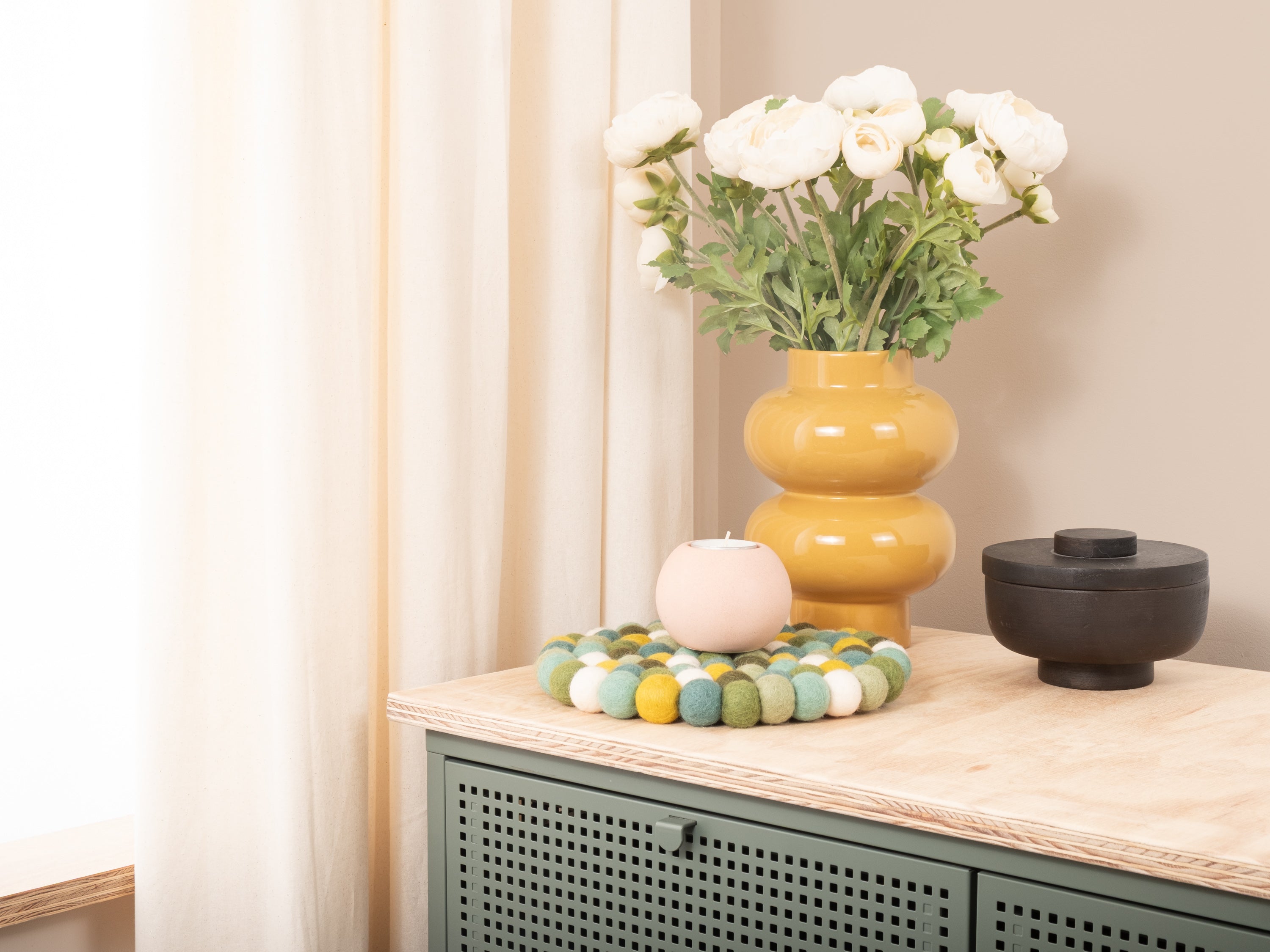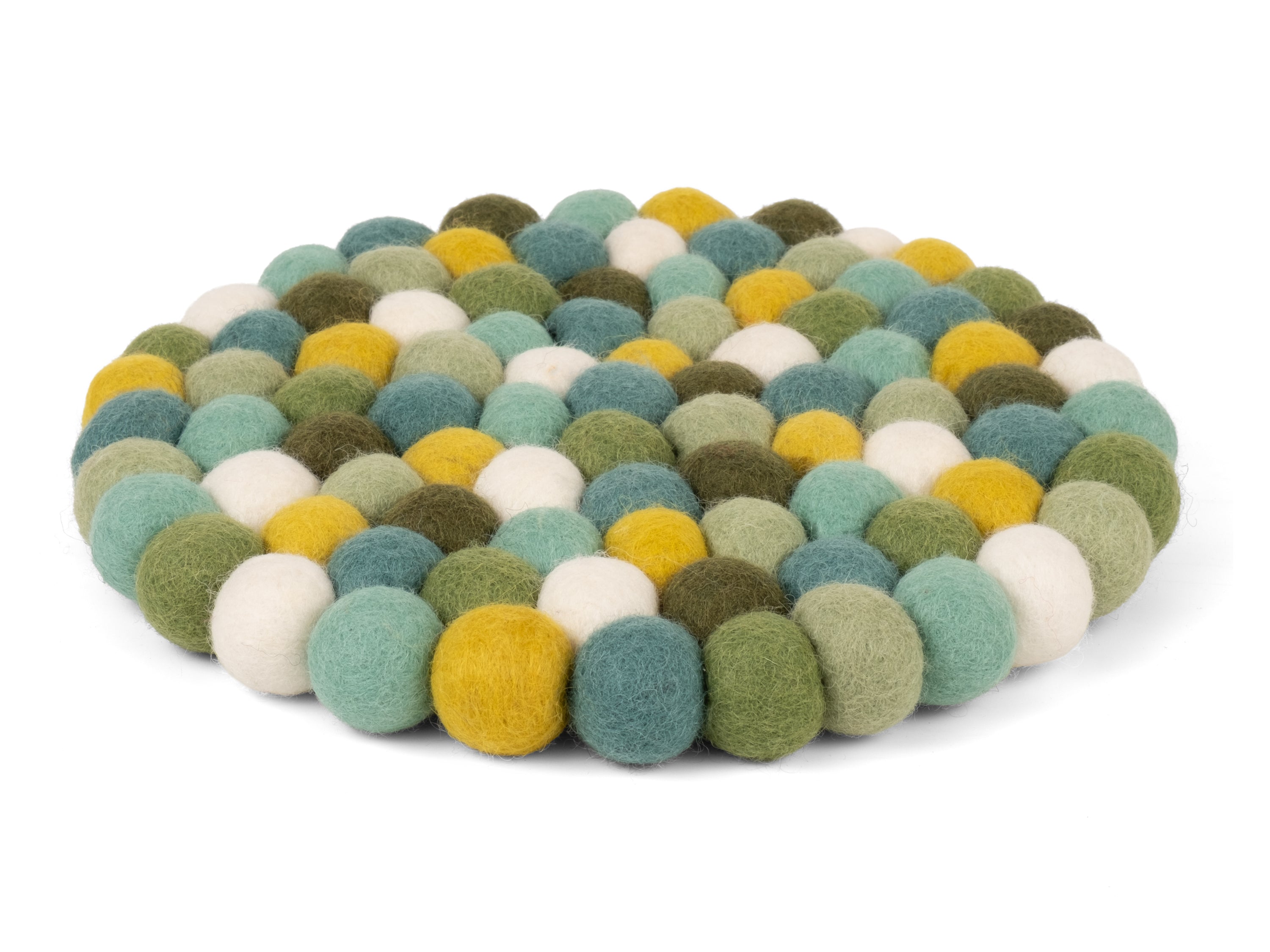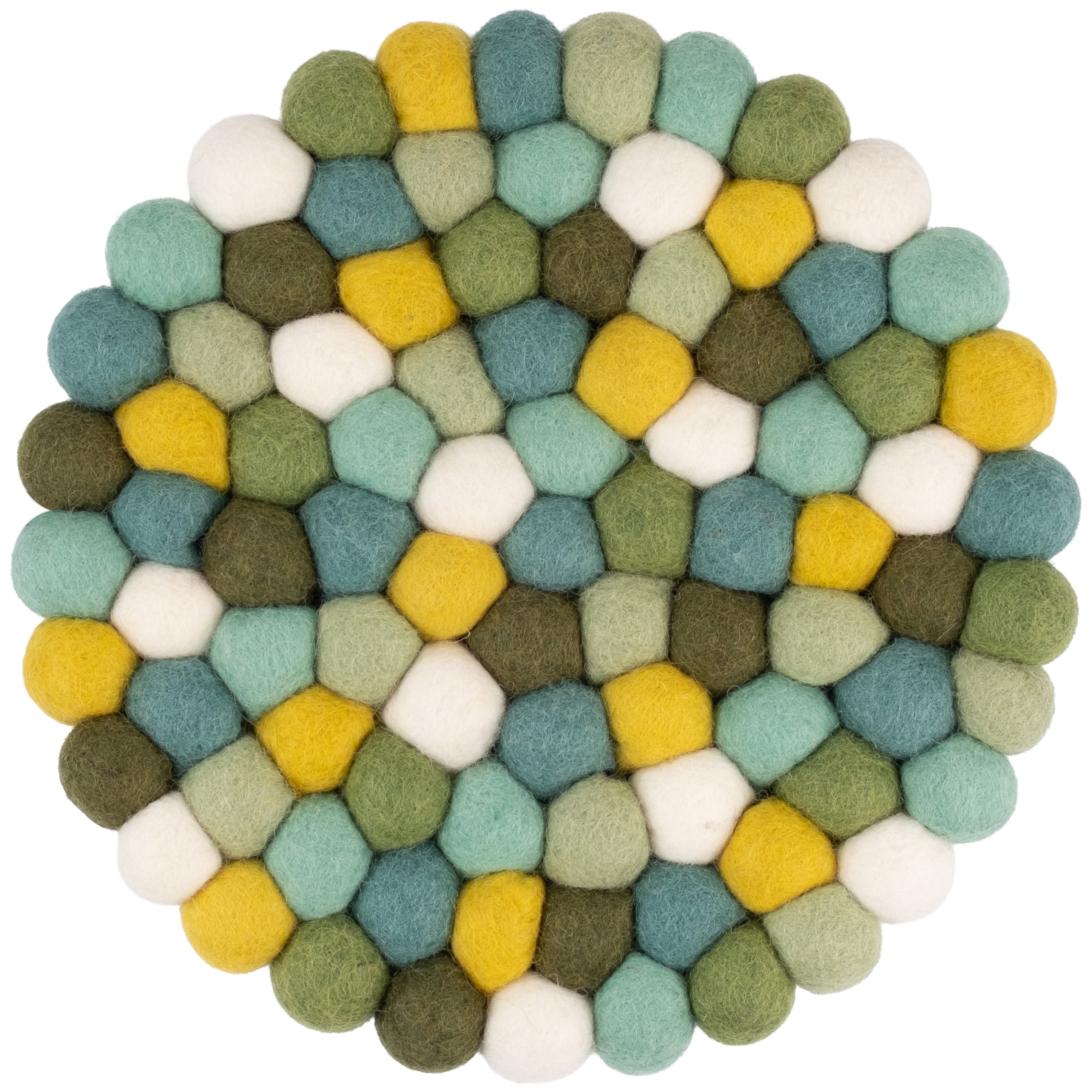 Round, multicoloured trivet in green / turquoise / white made of pure new wool | myfelt