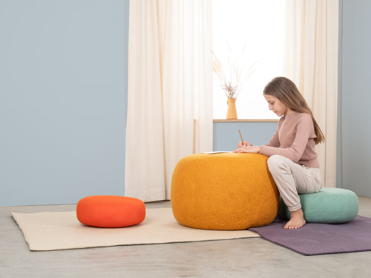 The subtle turquoise-gray Pouf Fine (18 cm) is a universally handy and practical seating option. As an exclusive natural product, the stool is elaborately hand-felted in many layers and consists of 100% finest new wool (pure wool filling without polyester or synthetics). Whether used as a meditation and seat cushion or a high-quality design element: variously combined, it completes extraordinary interior concepts. Thanks to its complete wool felt filling, the pouf is water and dirt repellent and offers optimal firmness.